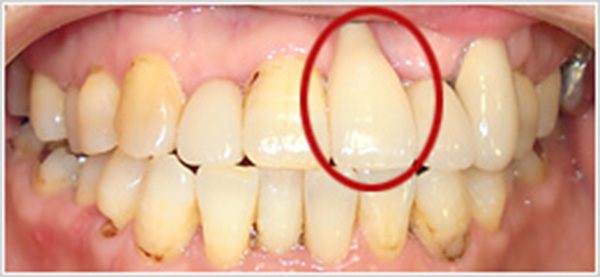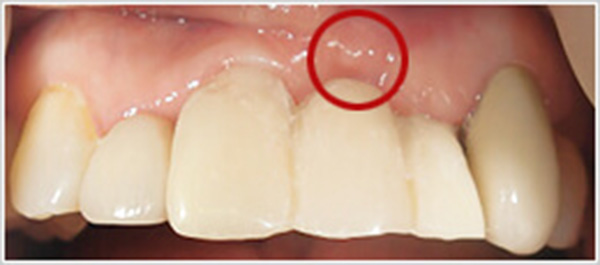 横から見てみると、他の歯と比べて圧倒的に歯が長くなっています。 しかも、歯ぐきからインプラントが透けて見えてしまっています。この状態から綺麗なかぶせ物を入れる方法はありません。
