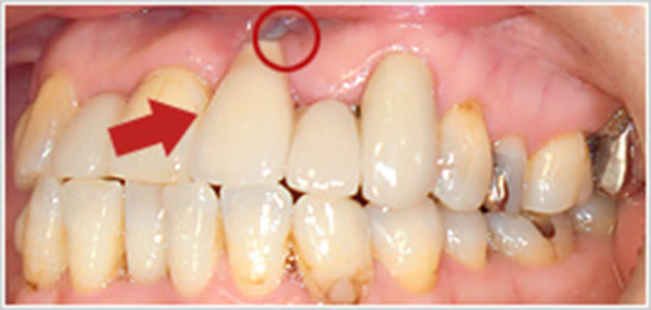 インプラントを入れる位置を間違ってしまっていることが原因で、前歯の部分が非常に長くなってしまっています。 前歯は「ここの部分にインプラントを入れる」という場所の決まりがあるのですが、違った場所にインプラントを入れてしまうと、上に被せたかぶせ物が長くなってしまいます。