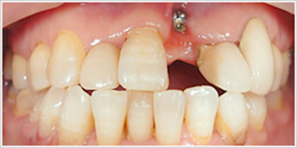 そこに歯ぐきの移植(歯ぐきを別の場所から持ってきて、ここに貼り付けて歯ぐきを膨らませる)をして仮歯を入れています。 仮歯の状態ですが、普段の生活をするにはひとまず大丈夫というところまで回復してきています。 まだこの後も治療は続くのですが、前歯のインプラントは非常に難しく、このような少しの間違いで失敗を起こす可能性があるのです。
