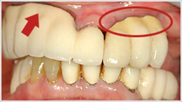 歯を失うと、周りの骨や歯ぐきまで一緒になくなってきてしまうことがあります。そういった場合、歯ぐきや骨を増やすインプラント治療もあるのですが、それでも限界があります。骨や歯ぐきを大きく失っている場合は、かぶせ物で歯ぐきの部分を補う治療方法もあります。