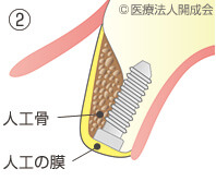 露出したインプラントの周りに人工骨を入れて人工の膜(メンブレン)で覆い、固定します。