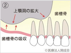 上顎の歯がなくなると、歯槽骨の吸収が進行して上顎洞は図のように下へ拡大します。 両側から骨吸収が進んでしまうので、歯槽骨はさらに薄くなります。 - 骨を増やす治療
